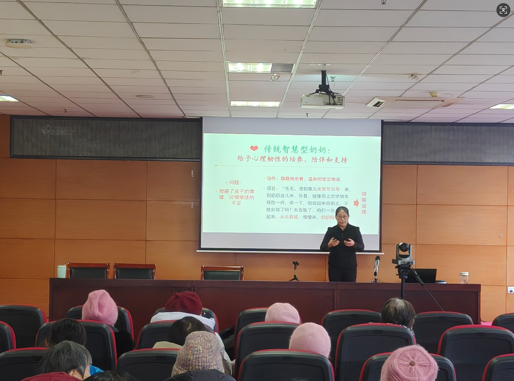 讲座内容紧密围绕隔代教育的核心需求与常见困惑,从传统智慧型奶奶给予心理韧性的培养、陪伴和支持说起,围绕四大板块内容,层层递进,系统展开:一是从毕生发展观看老年智慧,引导老年人认识自身经验与智慧的独特价值,进一步增强参与孙辈教育的自信心与自我价值感。二是隔代教育的独特优势与时代挑战,系统分析了隔代养育的优势与不足,并结合信息化时代特点,提出从“隔代抚养”转向“代际共学”的实践策略。三是祖孙趣味互动指南,提供一系列易于操作、富有趣味的互动方法,帮助老年人在日常生活中实现高质量陪伴,增进祖孙感情。四是隔代教育经验分享与互动,两位老师针对观众提出的具体问题进行细致解答,并结合真实案例展开交流,现场气氛热烈。整场讲座既有理论高度,又贴近实际,受到老年朋友们的普遍好评。大家纷纷表示,讲座“很及时、很解渴”、“既讲清了道理,又交给了方法”、“感觉自己更能跟上时代了”。