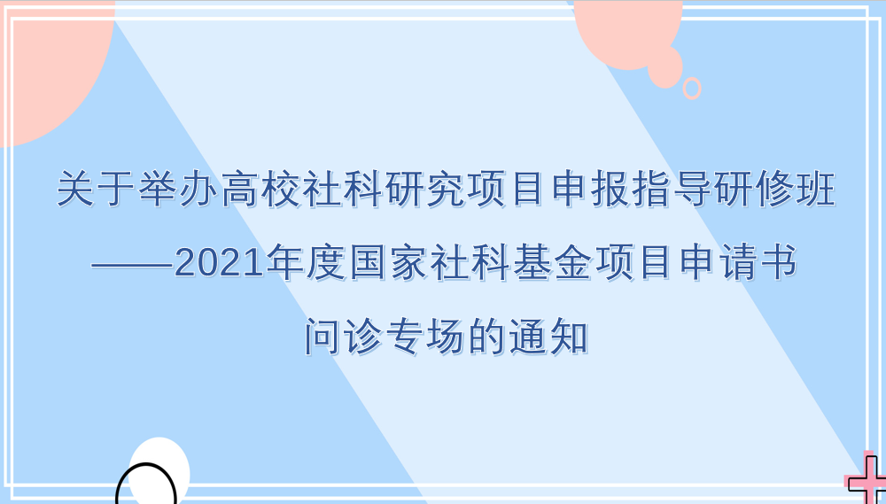 各有关单位:为帮助广大教师及研究人员查找2021年度国家社科基金项目申请失败的原因,发现及纠正申请书错误,响应有关要求,中国现代教育研修中心拟举办“高校社科研究项目申报指导研修班­——2021年度国家社科基金项目申请书问诊专场”。现将